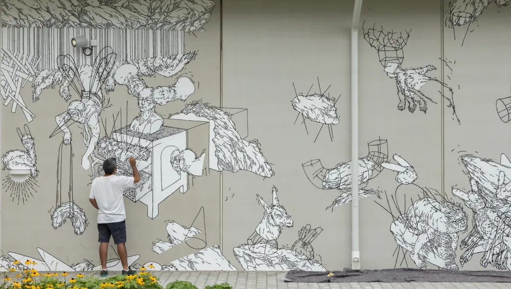 Muhammad Alis väggmålning Under stenen finns på museets innergård. Det är en fängslande väggmålning som blottar verklighetens dolda mekanismer. Inspirerad av vandringar i Grötviks stenbrott och av surrealismens lekfulla spel mellan fantasi och verklighet, bjuder målningen in oss att utforska de mysterier som ligger bortom det vi känner till och ser omkring oss. Där inget är vad det verkar vara.